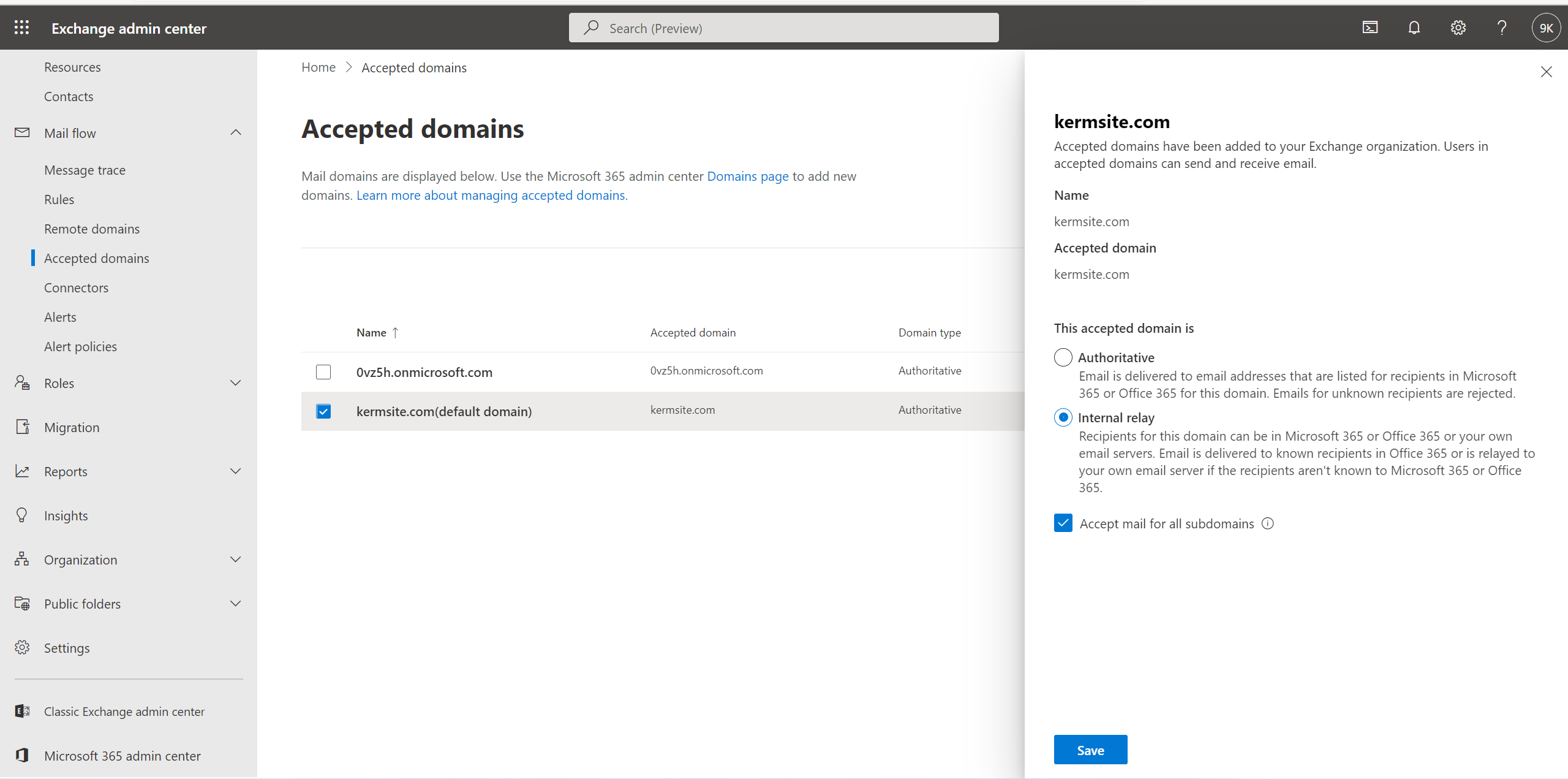 如图,对于你的域名,设置Internal relay,这样exchange就会将所有邮件都纳入收件中。